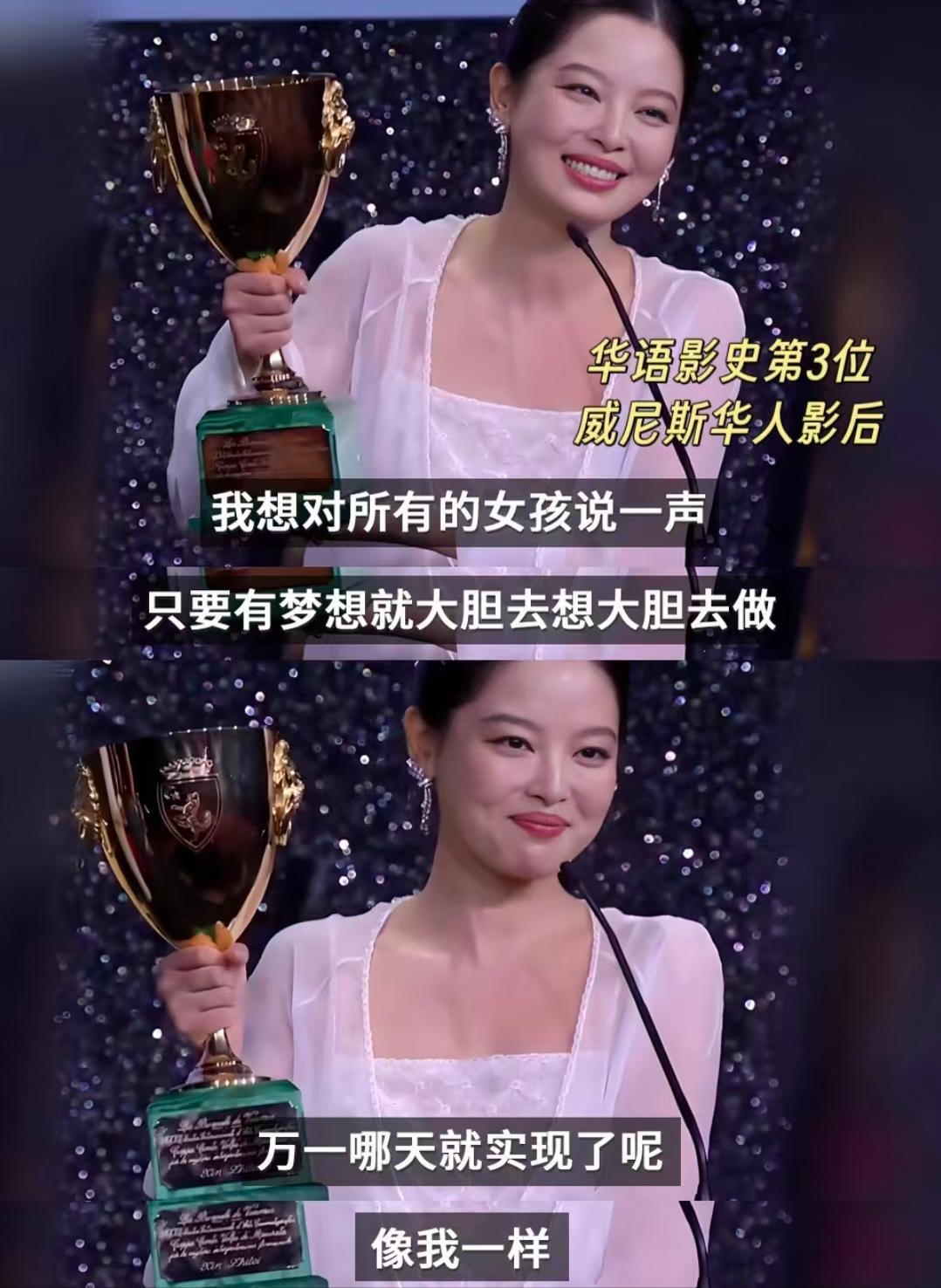 不仅终结华语女演员14年威尼斯影后空白,还成为首位内地80后欧洲三大影后,央视六套更是怒赞其“实至名归” 。