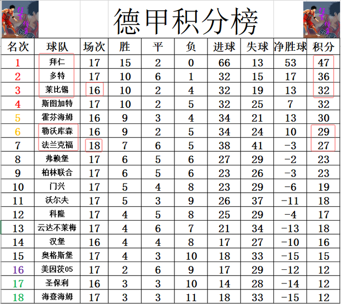 积分榜方面,拜仁上半程以11分的巨大优势轻松拿到半程冠军,本轮他们将在客场对阵下半程第一个对手莱比锡,本赛季首轮拜仁就是在主场6:0狂胜莱比锡开了个好头,现在莱比锡和多特是潜在的稍微有些可能追赶拜仁的球队,因此本轮客场再战莱比锡,将是拜仁下半程的关键一战。法兰克福今天本有机会追上勒沃库森,只是两度领先没有把握机会,最后绝平,差勒沃库森2分还是排在第7。